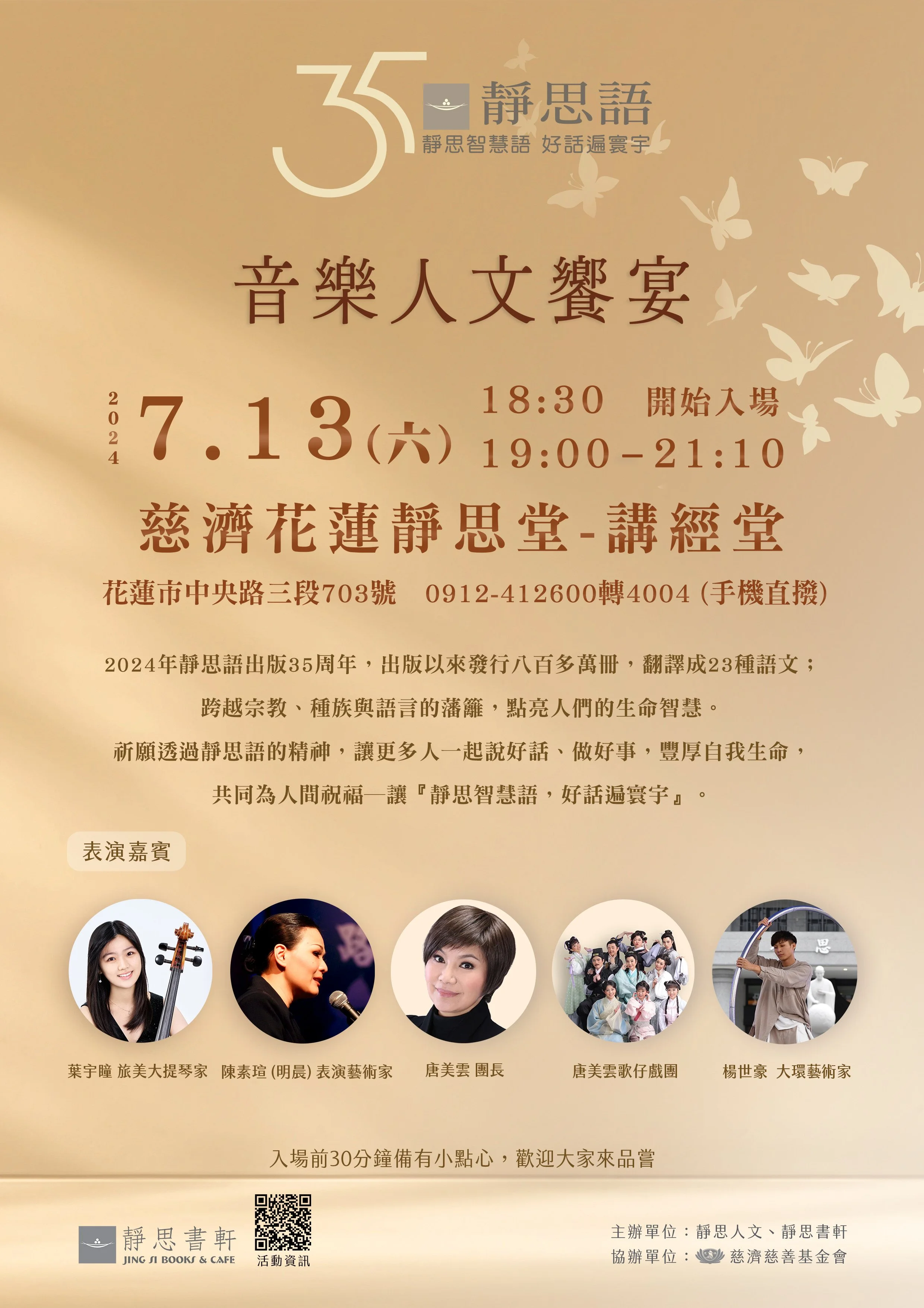 Tzu Chi Hualien Concert Saturday, July 13, 2024 6:40 PM 9:00 PM 慈濟花蓮靜思堂 703 Zhongshan Road Hualien County, 970 Taiwan (map) Google Calendar ICS